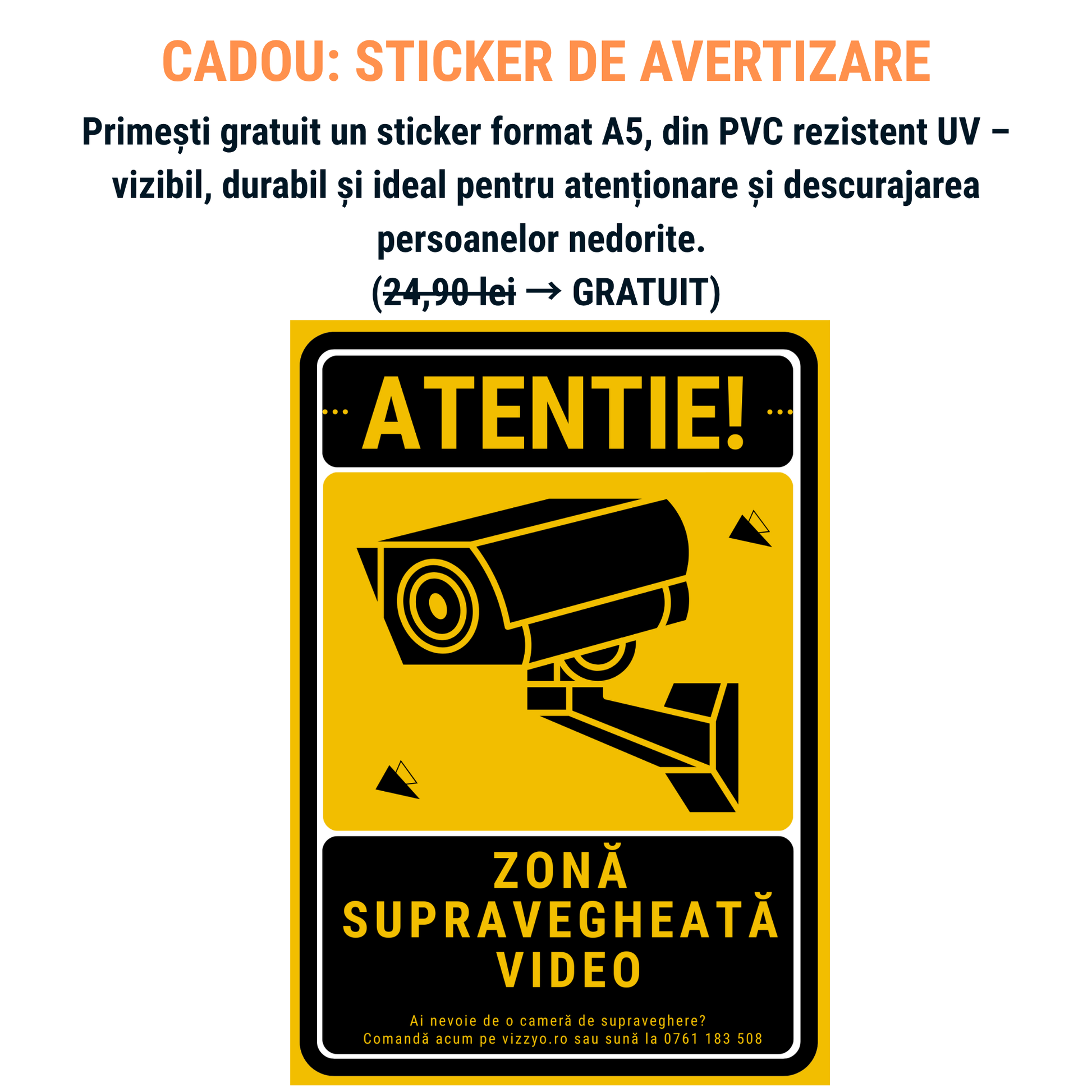🎁 CADOU: Primești sticker avertizare „Atenție! Zonă Supravegheată Video” – format A5, PVC tratat UV, perfect pentru descurajarea intrușilor (24,90 lei → GRATUIT)