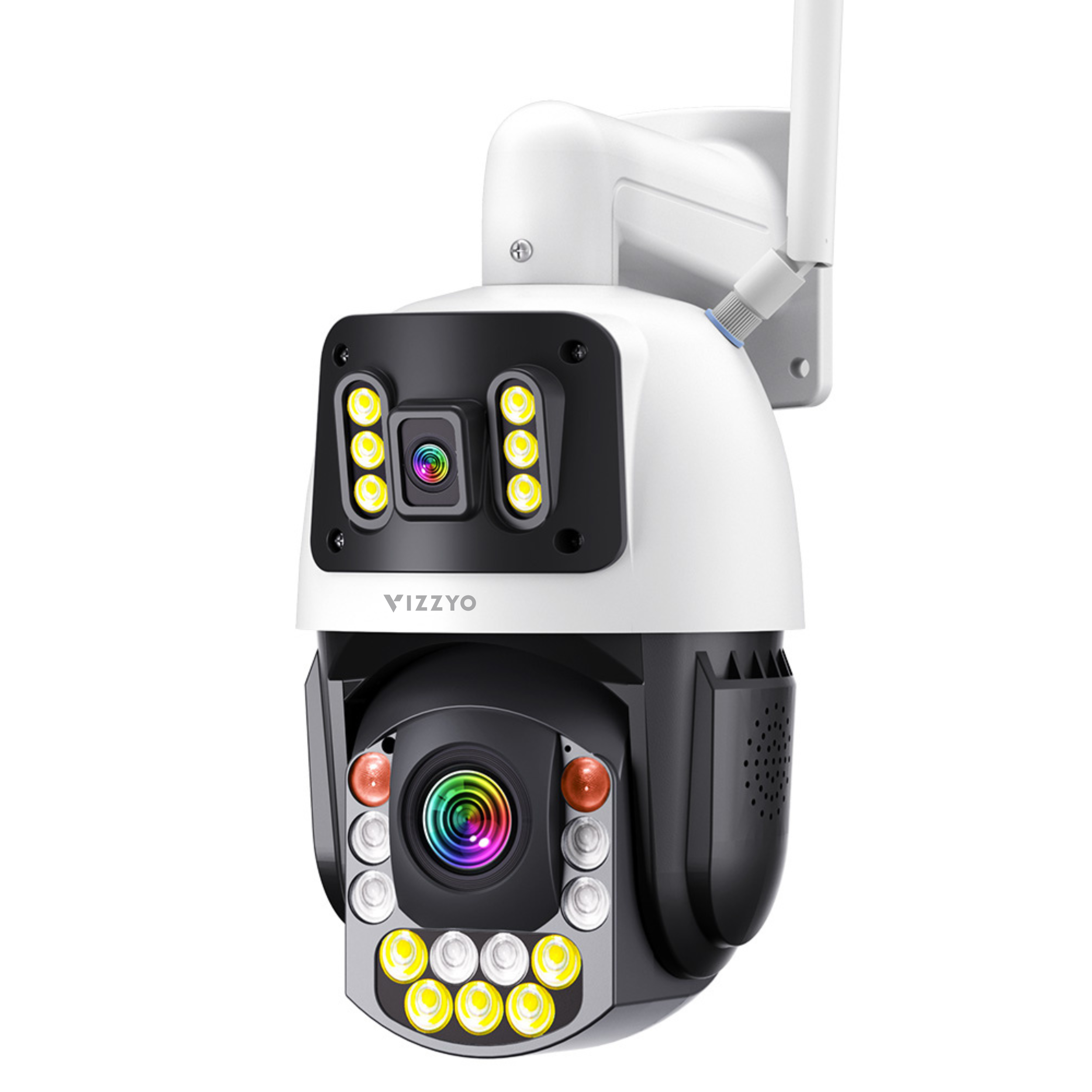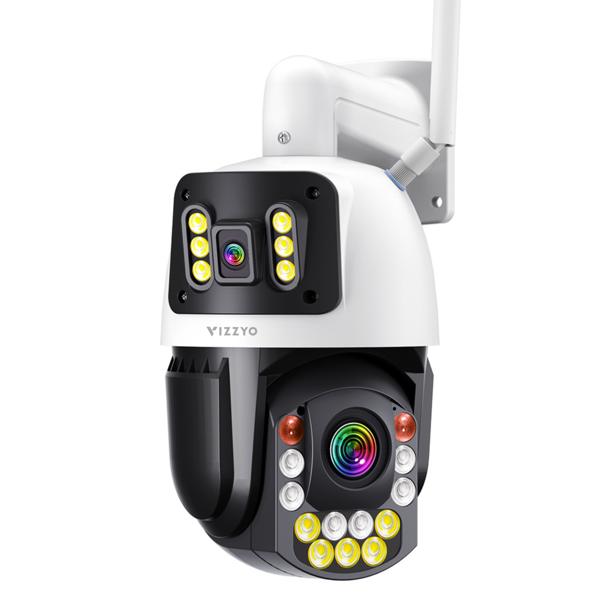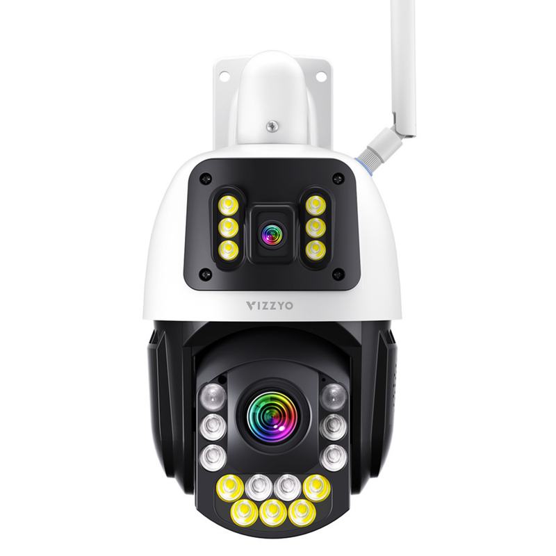 Vizzyo Eagle Pro combină o cameră fixă de 3.6 mm cu o cameră PTZ varifocală 5.9–94.4 mm, pentru o supraveghere mai flexibilă și mai eficientă. Camera superioară păstrează permanent imaginea de ansamblu, iar camera rotativă de jos îți permite să verifici rapid detaliile importante și să monitorizezi mai bine zonele aflate la distanță.