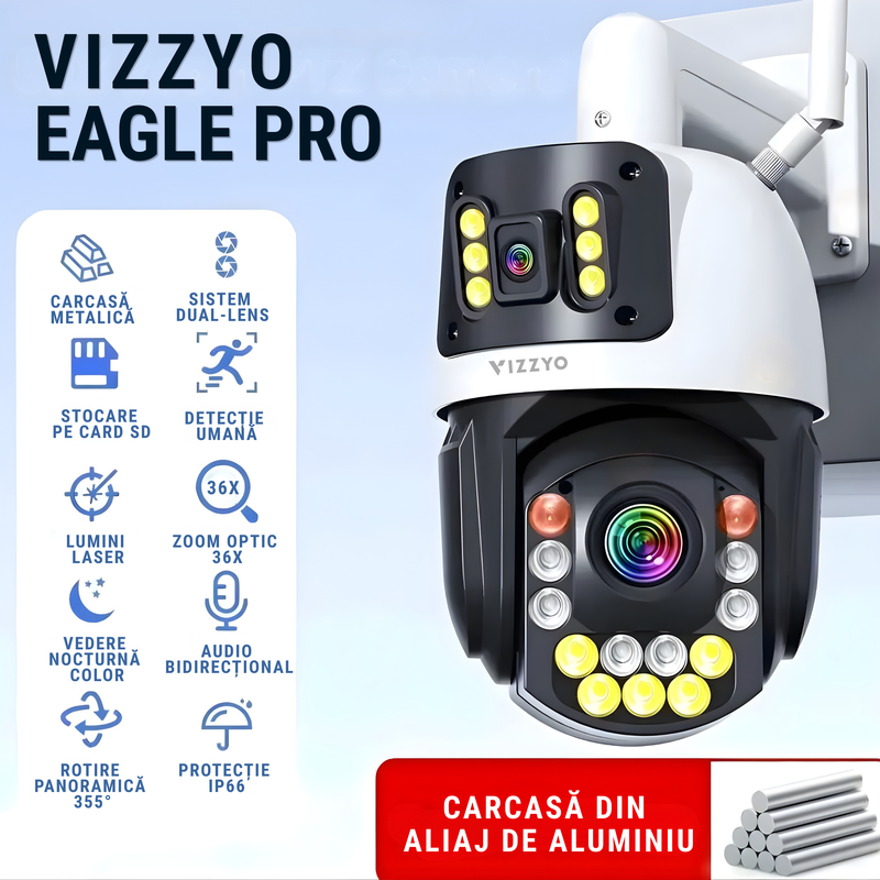 Vizzyo Eagle Pro este echipată cu zoom optic 36X, conceput pentru a oferi imagini clare și detaliate chiar și atunci când zona supravegheată se află la distanță mare. Este o funcție ideală pentru monitorizarea curților, parcărilor, halelor, fermelor, depozitelor sau altor perimetre extinse, unde o cameră obișnuită nu poate surprinde suficient de bine detaliile importante.