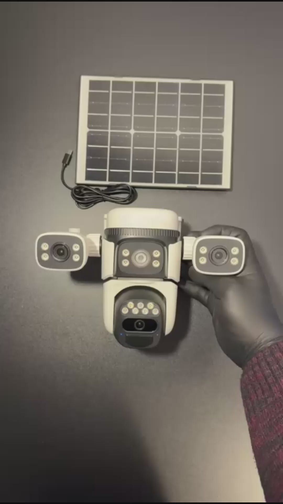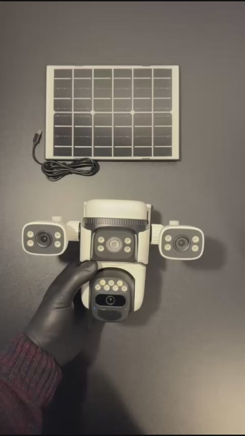 Sistemul integrează trei camere independente: o unitate centrală PTZ motorizată și două camere laterale reglabile manual. Împreună, acestea oferă o acoperire panoramică de 360°, fără unghiuri moarte. Camera centrală se rotește până la 270° pe orizontală și 90° pe verticală, iar cele laterale pot fi ajustate manual până la 180°, pentru o monitorizare perfect adaptată nevoilor tale.