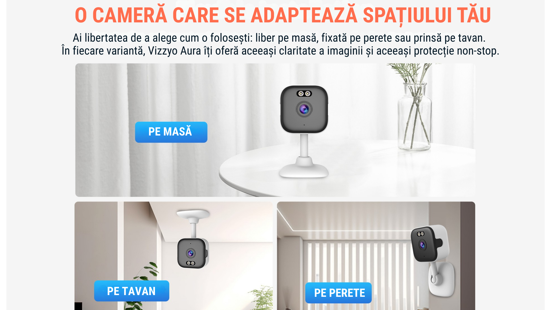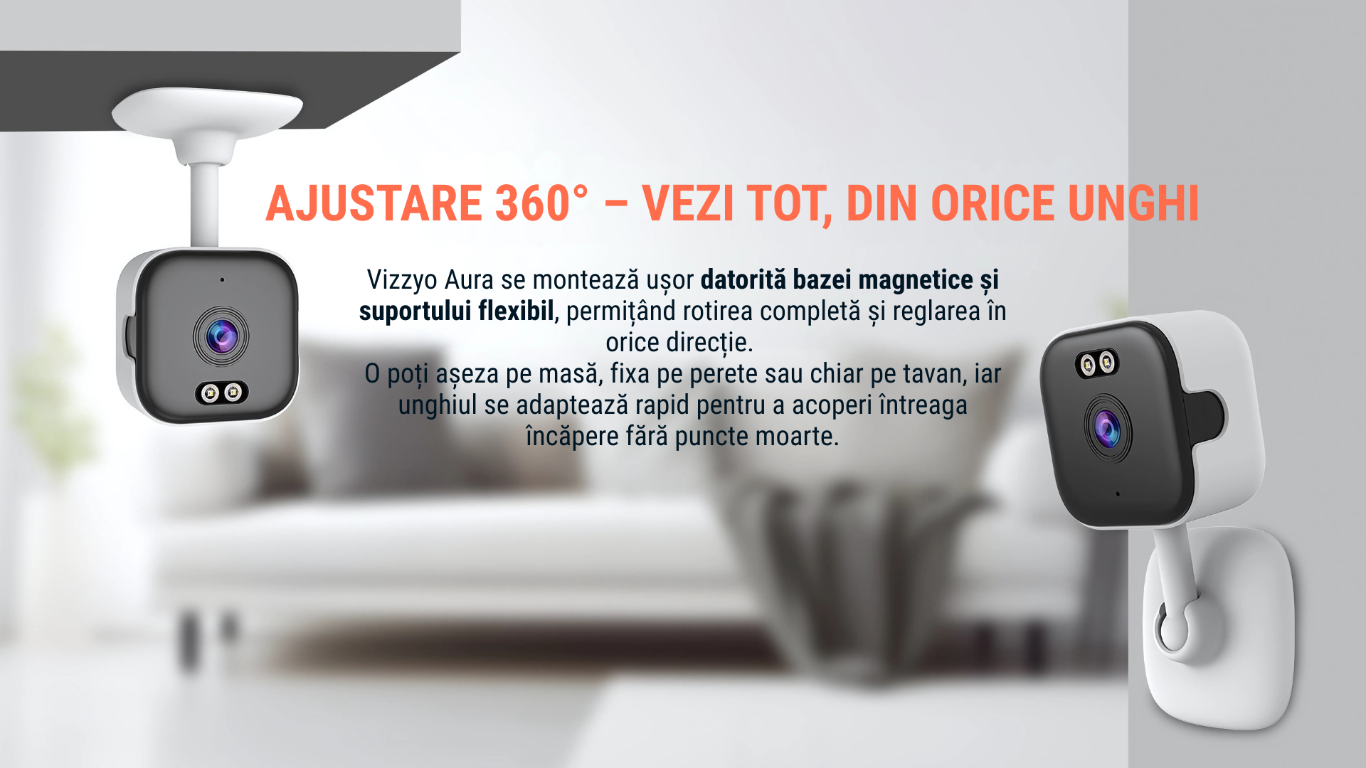 Indiferent dacă vrei să supraveghezi livingul, camera copiilor, biroul sau un mic magazin, Vizzyo Aura se integrează perfect în orice decor. Poți să o așezi discret pe o comodă sau pe un raft, să o montezi pe perete pentru un unghi clar sau pe tavan pentru o acoperire mai amplă – suportul magnetic și prinderea flexibilă îți permit să alegi rapid poziția ideală.