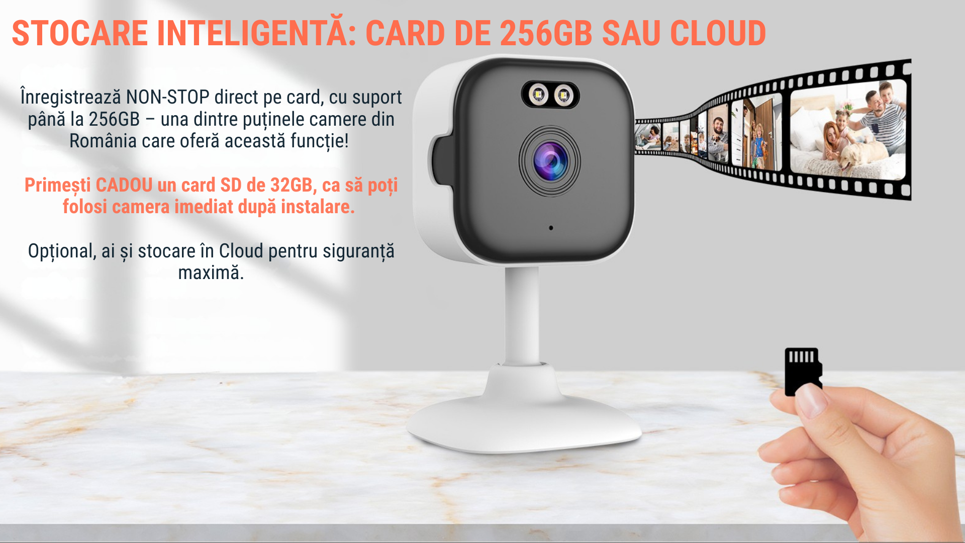 📌 Bonus exclusiv: În pachet primești GRATUIT un Card MicroSD de 32GB (clasa 10), pentru ca înregistrarea să înceapă imediat, fără costuri suplimentare.