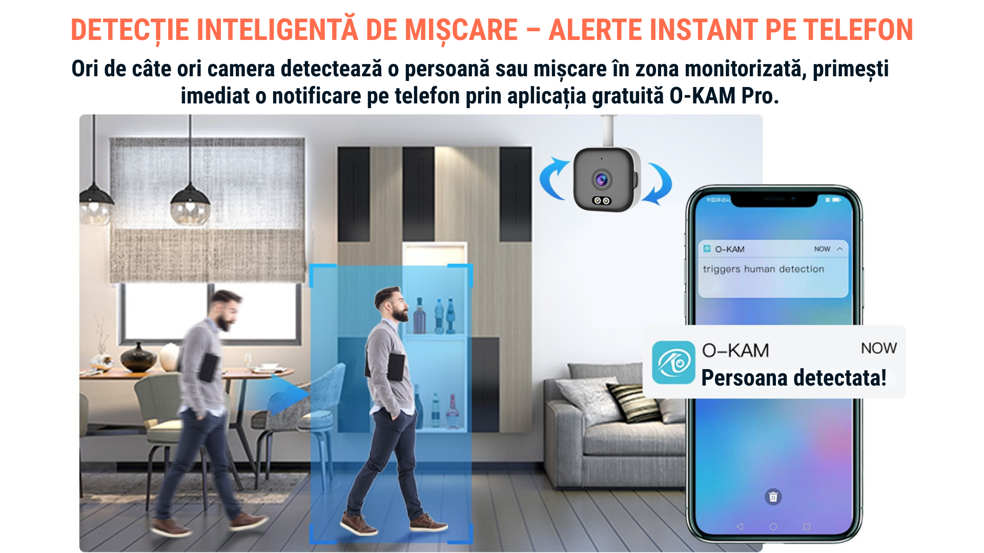 Camera detectează automat mișcarea și prezența umană, trimițând alerte instantanee direct pe telefon prin aplicația gratuită O-KAM Pro. Cu funcția audio bidirecțională, poți comunica în timp real – fie că verifici copiii, îți saluți părinții sau liniștești animalele de companie.
