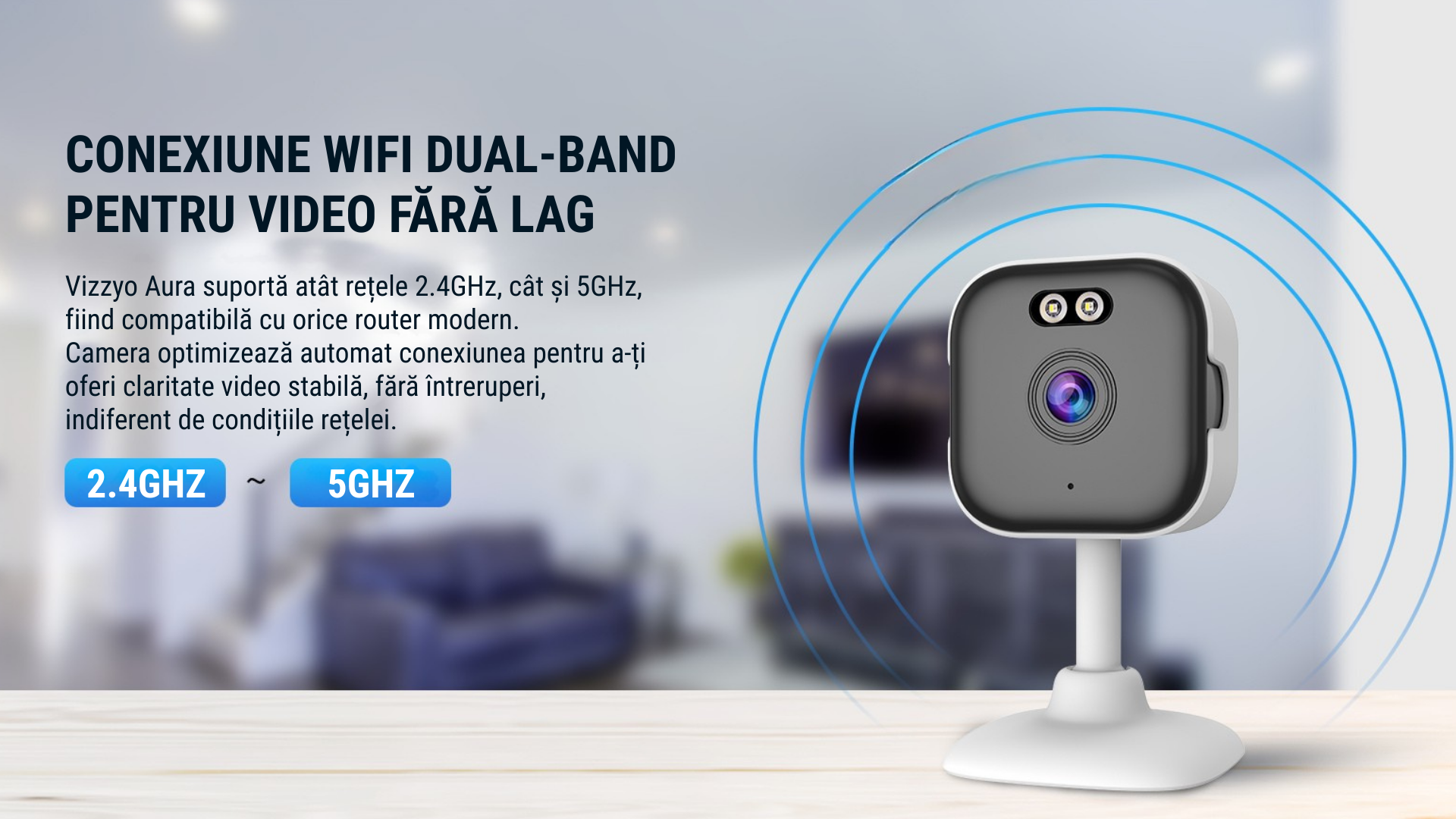 Vizzyo Aura suportă atât rețele WiFi de 2.4 GHz, cât și de 5 GHz, oferindu-ți libertate totală de conectare în funcție de rețeaua disponibilă. Astfel, te bucuri de: