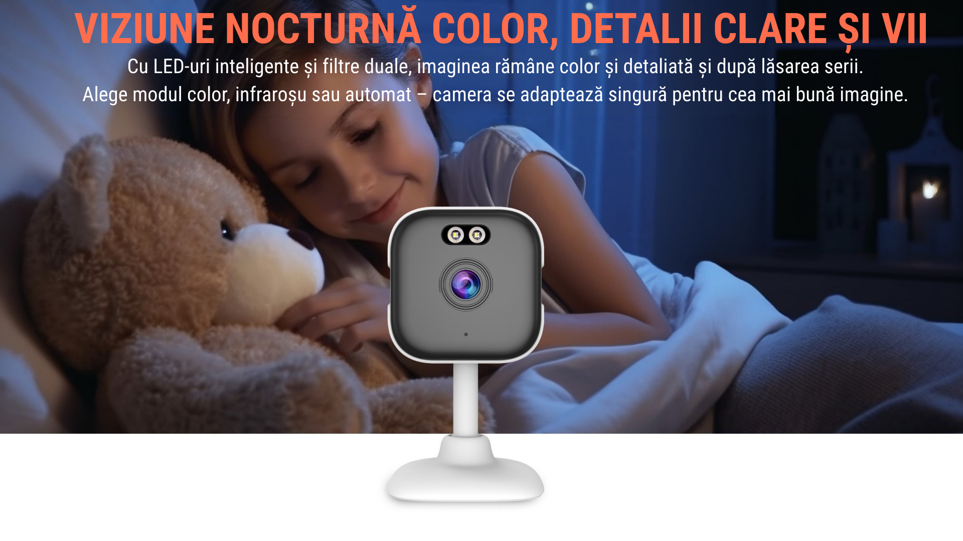 Mod Inteligent: Economisiți energie și beneficiați de o supraveghere discretă. Camera comută automat de la modul infraroșu la modul color atunci când detectează mișcare, captând imagini clare și colorate ale evenimentului.