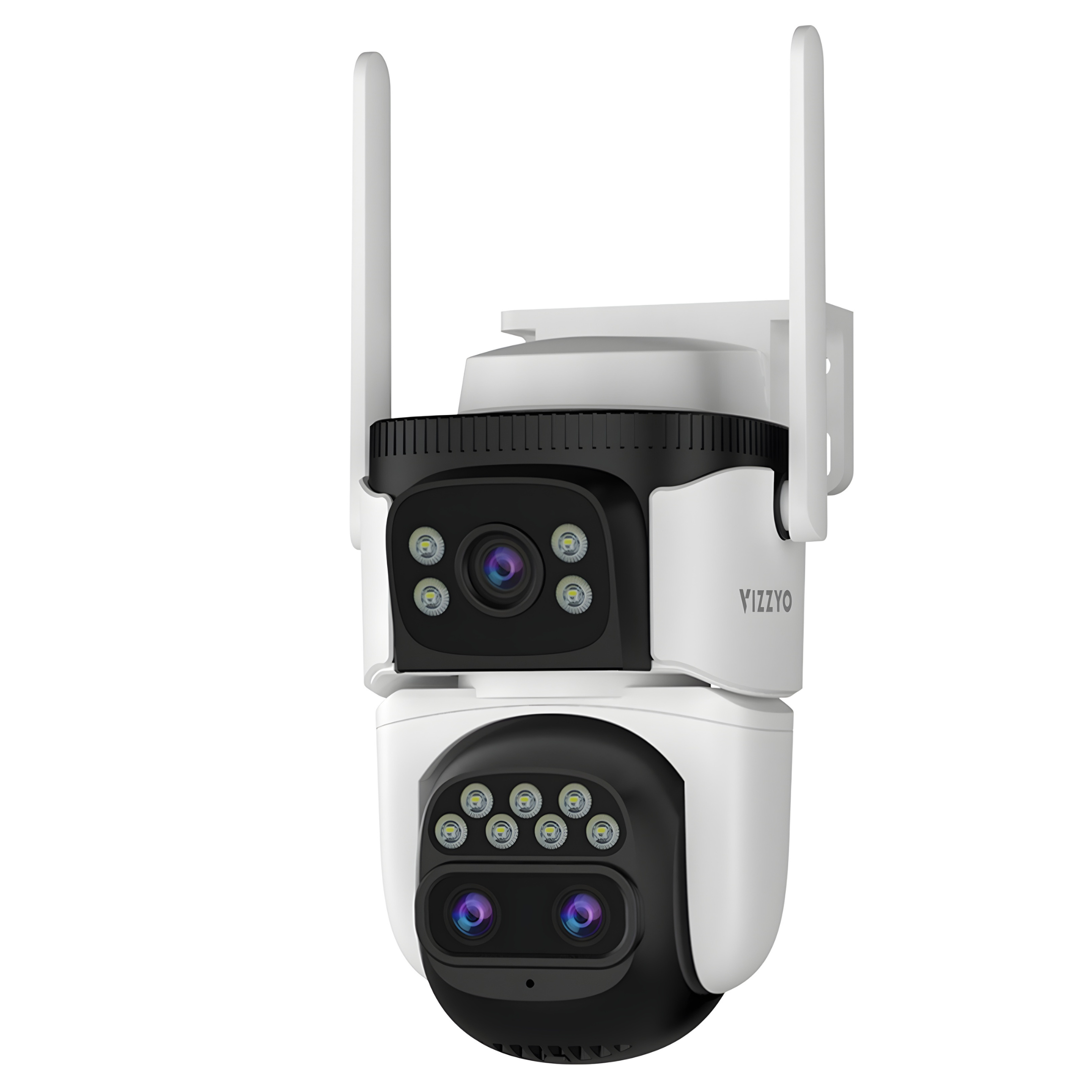 Vizzyo Dual Defender Pro este o cameră de supraveghere WiFi inteligentă, concepută pentru protecție avansată și acoperire extinsă. Dispune de două module integrate: o cameră fixă poziționată în partea superioară și o cameră PTZ rotativă în partea inferioară, echipată cu două lentile performante – una ultra-wide și una telefoto cu zoom optic real 10X. Această combinație oferă atât un câmp vizual larg, cât și detalii clare la distanță.