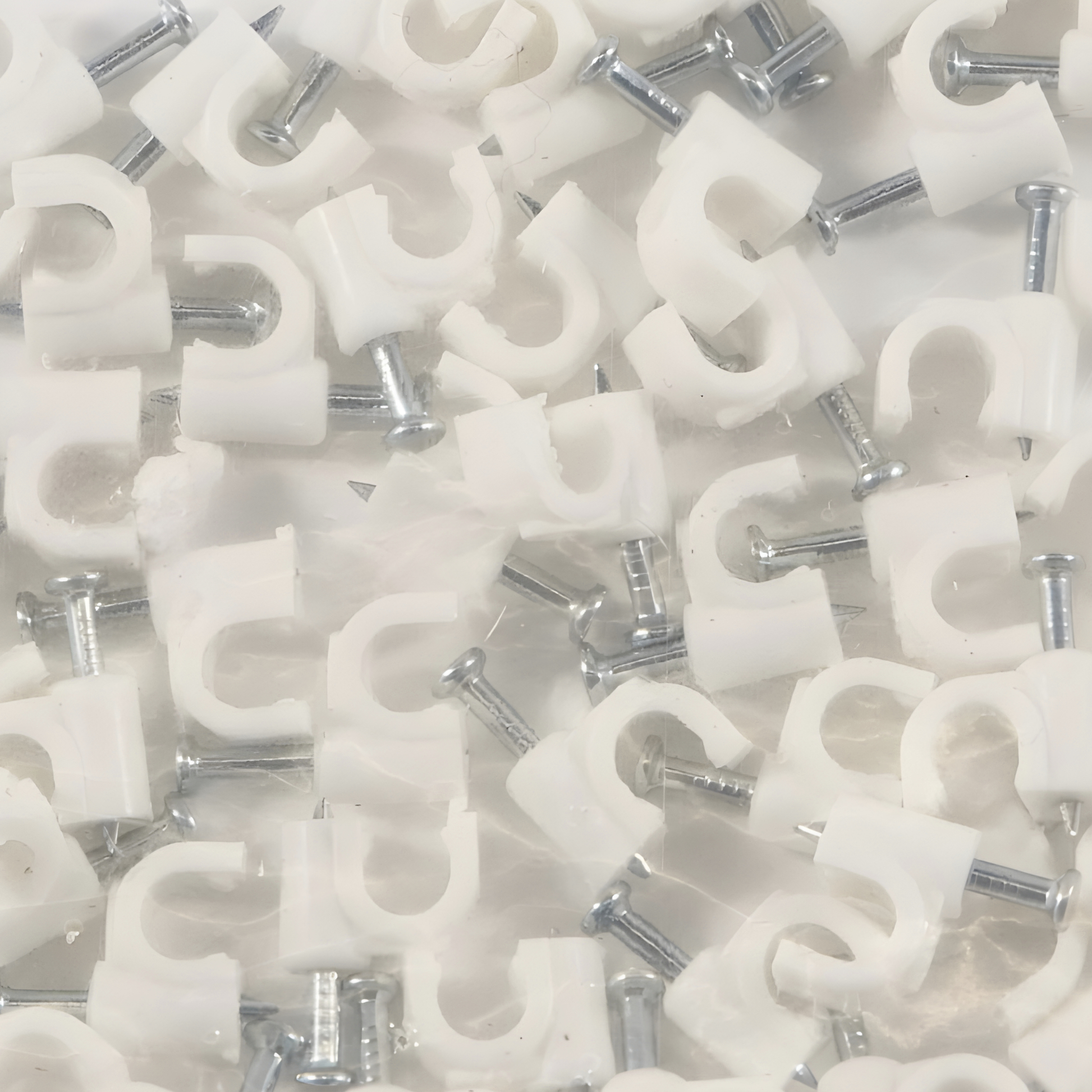 Cleme de fixare pentru cablu, potrivite pentru organizarea și prinderea cablurilor la interior. Realizate din PVC, de culoare albă, sunt ideale pentru un montaj rapid și ordonat. Setul conține 50 de bucăți.